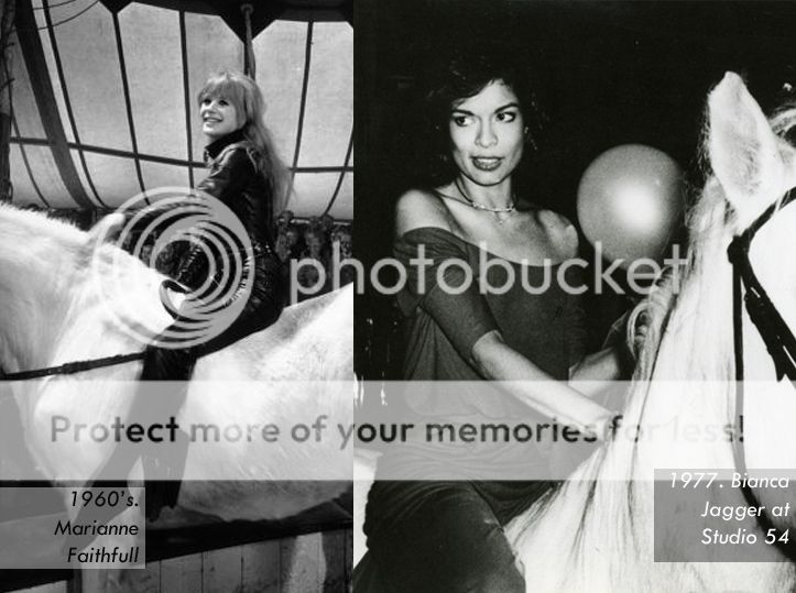 Marianne Faithfull is very "Emma Peel-esque" in this picture, as a "SM-CHICissime" horse-breaker !!! And Bianca Jagger full of sulfurous charisma . . . Such striking parallelism !!!